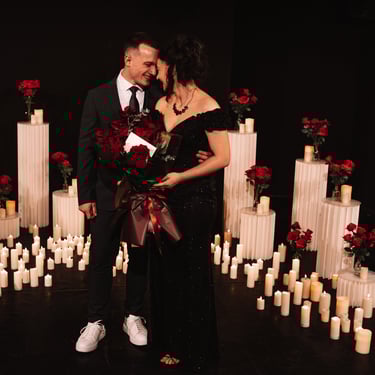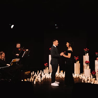 O sală de teatru transformată într-un spațiu intim, un concert pian–vioară și o scenă plină de lumânări, creată exclusiv pentru voi doi.